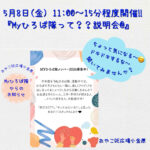 2026年4月19日 / 最終更新日時 : 2026年4月19日 おやこDE広場小金原STAFF お知らせ 5/8(金)『Myひろば隊って??@説明会』 おやこDE広場小金原 『Myひろば隊って⁇説明会☺︎』 5/8(金)11:00〜15分程度開催します。 『Myひろば隊』って⁇ 「なんだろう⁇」「やってみたいな!!」 と思ったあなた!! ひろば隊ってどんな […]