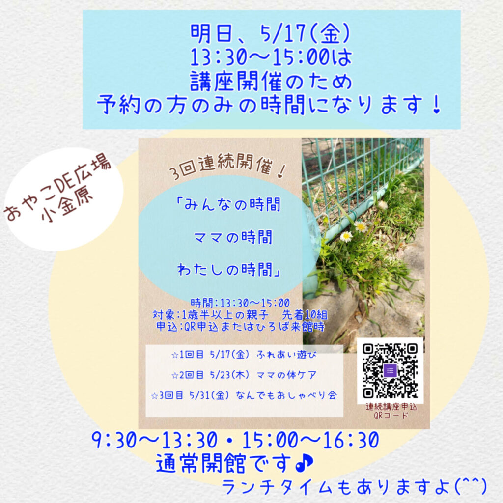 明日、5/17(金)講座開催中13:30〜15:00は予約の方のみの時間になります。