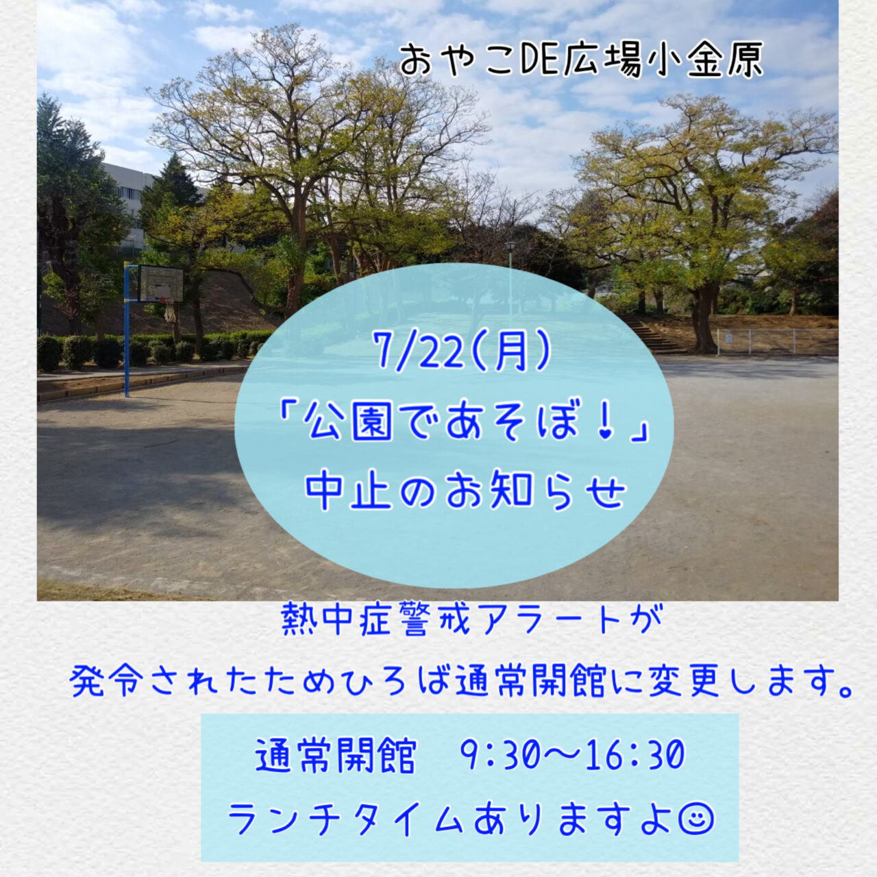 本日、7/22(月)「公園であそぼ!」中止します。