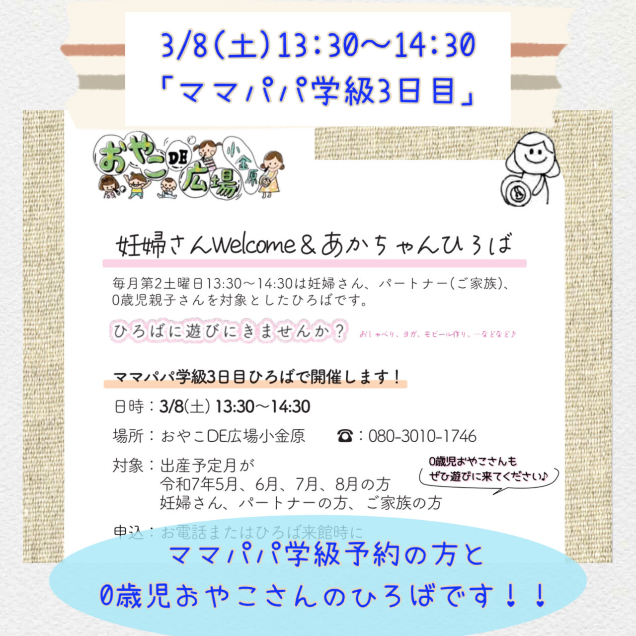 3/8(土)13:30〜14:30「ママパパ学級3日目」の時間です。