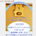 2025年8月18日 / 最終更新日時 : 2025年8月18日 おやこDE広場小金原STAFF お知らせ 開館場所変更のお知らせ 8/21(木) 【ひろばから開館場所変更のお知らせ】 九丁目町会夏まつりの準備のため、 九丁目会館の使用が困難になりました。 8月21(木)タウンスクールのひろば 9:30〜16:30通常開館に変更します。 九丁目会館のひろばはお休みで […]