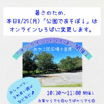 2025年8月25日 / 最終更新日時 : 2025年8月25日 おやこDE広場小金原STAFF 予定 本日、8/25(月)「公園であそぼ!」暑さのため「オンラインひろば」に変更します。 本日、8/25(月)「公園であそぼ!」は 暑さのため「オンラインひろば」に 変更します。 ひろばとつながってちょっと一息しませんか? おしゃべり&ふれあい遊びなど☺︎ ひろばからでも、お家からでも、 参加で […]