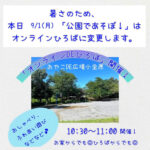 2025年9月1日 / 最終更新日時 : 2025年9月1日 おやこDE広場小金原STAFF 予定 本日9/1(月)「公園であそぼ」は「オンラインひろば」に変更します。 おはようございます。 本日、9/1(月)「公園であそぼ!」は 暑さのため「オンラインひろば」に 変更します。 ひろばとつながってちょっと一息しませんか? おしゃべり&ふれあい遊びなど☺︎ ひろばからでも、お […]