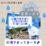 2024年11月21日 / 最終更新日時 : 2024年11月21日 おやこDE広場小金原STAFF お知らせ 本日、11/21(木)「公園であそぼ!」中止します。 おはようございます♪ 本日、11月21日(木)の 「公園であそぼ!」は雨のため中止します。 ひろばは、9:30〜16:30通常開館です☺︎ ひろばで待ってます♪