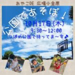 2024年10月16日 / 最終更新日時 : 2024年10月16日 おやこDE広場小金原STAFF お知らせ 10月17日(木) 公園であそぼ! おやこDE 広場小金原 10月17日(木) 9:30~12:00は 「公園であそぼ!」の日です♪ つばめ公園で待ってま~す♪