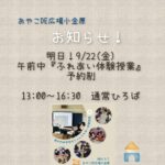 2023年9月21日 / 最終更新日時 : 2023年9月21日 おやこDE広場小金原スタッフ2 お知らせ お知らせ!9/22(金)ひろば おやこDE 広場小金原 【お知らせ】 明日9/22(金) 『ふれあい体験授業』予約制 午前中 ひろばは 13:00~16:30通常ひろば となります 足元に気をつけておこしくださいね ※※※※※※※※※※※※※※※※※※ […]