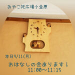 2023年9月11日 / 最終更新日時 : 2023年9月11日 おやこDE広場小金原STAFF お知らせ おはなしの会 本日、9/11(月) おはなしの会があります。 11:00〜11:15 手遊びなど一緒に楽しみませんか? 涼しくしてお待ちしてます(^^)