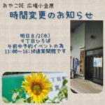 2023年8月1日 / 最終更新日時 : 2023年8月1日 おやこDE広場小金原スタッフ2 お知らせ 時間変更のお知らせ!8/2(水) おやこDE 広場小金原 明日8/2(水)9丁目ひろば 【時間変更のお知らせ】 午前中、申込み制イベントの為 13:00~16:30通常開館となります 猛暑続いてます 水分補給忘れないように♪ ※※※※※※※※※※※※※※ […]
