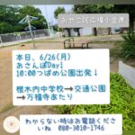 2023年6月26日 / 最終更新日時 : 2023年6月26日 おやこDE広場小金原スタッフ2 お知らせ 本日、6/26おさんぽDay おやこDE広場小金原 本日、6/26(月) おさんぽday ! 10時 つばめ公園出発予定♪ 根木内中学校~交通公園~万福寺あたり 途中合流する方、わからない時は電話してね。♪ 080-3010-1746