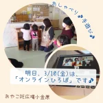 2023年3月9日 / 最終更新日時 : 2023年3月9日 おやこDE広場小金原STAFF お知らせ 明日、3/10(金)「オンラインひろば」ありますよ。 明日、3/10(金)10:30~11:00は 「オンラインひろば」です(^-^) おしゃべり♪手遊び♪ いっしょに楽しみませんか? ご参加お待ちしてます!