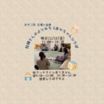 2022年12月16日 / 最終更新日時 : 2022年12月16日 おやこDE広場小金原STAFF ひろばの様子 おやこDE地域交流まつり2022【折り紙で遊ぼう&絵本の時間】 『おやこDE地域交流まつり2022』 11/23(水)24(木)25(金)3日間連続開催 11月25(金)♪ 交流まつり最終日、 最終日の最後の時間はいつものひろばのようなゆったり時間( ´∀`) ☆折り紙で遊ぼう☆ 「 […]
