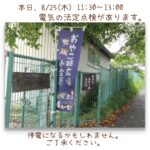 2022年8月25日 / 最終更新日時 : 2022年8月25日 おやこDE広場小金原STAFF お知らせ 本日、8/25(木)電気の法定点検のお知らせ 本日、8/25(木) 11:30~13:00まで 電気の法定点検があります。 停電になるかもしれません。 ご了承ください。 よろしくお願いいたします。 ひろばは開館中です(^-^)