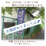 2022年8月25日 / 最終更新日時 : 2022年8月25日 おやこDE広場小金原STAFF お知らせ 本日、8/25(木)電気の点検終わりました。 電気の法定点検終わりましたよ♪ 午後も通常開館しています(^-^)