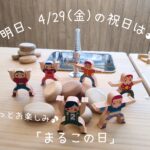 2022年4月28日 / 最終更新日時 : 2022年4月28日 おやこDE広場小金原STAFF お知らせ 明日、4/29(祝)は「まるこの日」です。 明日、4/29(祝)は… ちょっとお楽しみ♪ 祝日企画「まるこの日」です。 今回は、 「手形足形ペタペタこいのぼり」作ろう! どんなこいのぼりができるかな~?【開館時間】9:30~16:30 予約不要です♪ […]